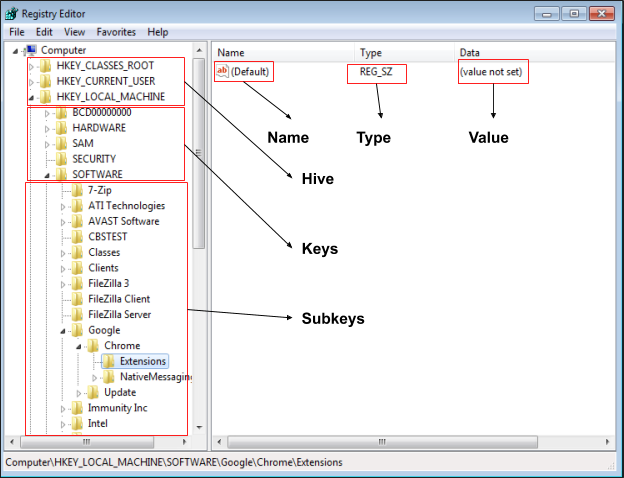 **The Registry** is a hierarchical database. At the top of the hierarchy is your **computer**. Under that, you’ll find the main branches, known as “<mark style="color:red;">**hives**</mark>” Within these hives are <mark style="color:red;">**Registry keys**</mark><mark style="color:red;">.</mark> Keys can contain <mark style="color:purple;">**sub-keys**</mark> and <mark style="color:purple;">**Registry values**</mark><mark style="color:purple;">.</mark>